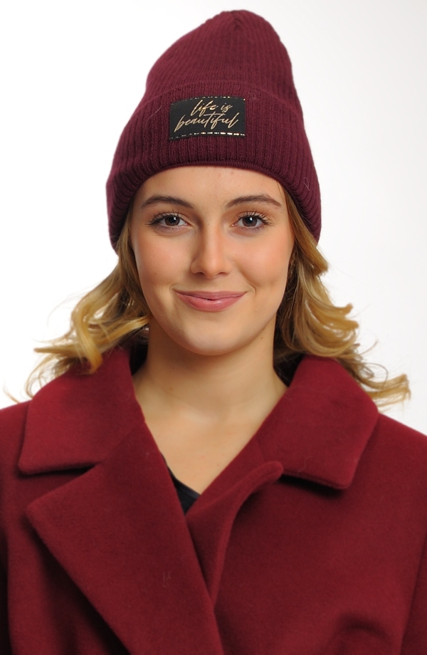 Stylová dívčí zimní čepice v bordó barvě je ideálním módním doplňkem pro chladné období. Je vyrobena z měkkého, pružného a hřejivého úpletu, který skvěle drží teplo a zároveň je velmi příjemný na nošení. Čepice má moderní střih s ohrnutým lemem, který dobře sedí a chrání čelo i uši před zimou. Přední část zdobí designová nášivka s nápisem „Life is beautiful“, která dodává čepici mladistvý a trendy vzhled. Díky elegantní bordó barvě se snadno kombinuje s kabáty i sportovními bundami a stane se oblíbeným zimním doplňkem pro každodenní nošení.