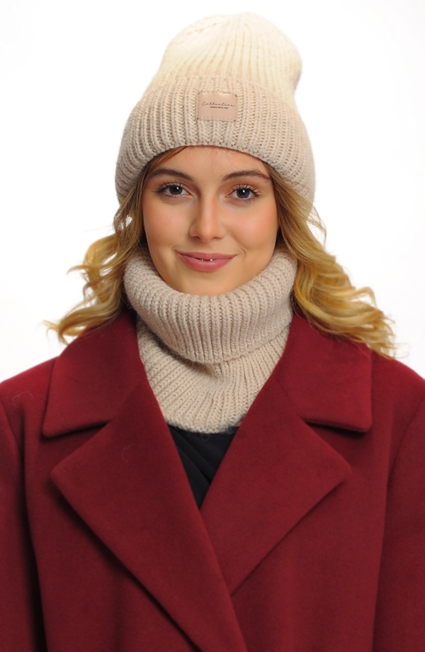 Dámská zimní čepice a pletený nákrčník v elegantní krémové barvě tvoří dokonale sladěnou sadu, která spolehlivě zahřeje i v nejchladnějším zimním počasí. Měkký a hřejivý materiál je příjemný na dotek, nekouše a krásně se přizpůsobí. Čepice má široký ohrnutý lem, který drží teplo a příjemně chrání čelo i uši. Přední stranu zdobí decentní nášivka, jež dodává moderní a stylový vzhled. Nákrčník je pletený z téhož materiálu a poskytuje vynikající ochranu krku i horní části hrudníku před chladem a větrem. Neutrální krémová barva se snadno kombinuje s jakýmkoliv zimním kabátem či bundou, takže je tato sada ideální pro každodenní nošení do města, do práce i na zimní procházky. Stylová, praktická a maximálně pohodlná – skvělá volba do zimy.