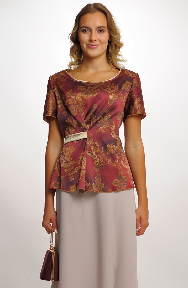Dámská společenská halenka s tiskem má univerzální střih, vhodný pro různé typy postavy.