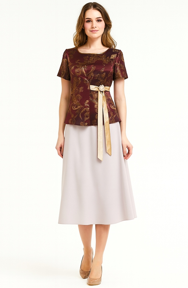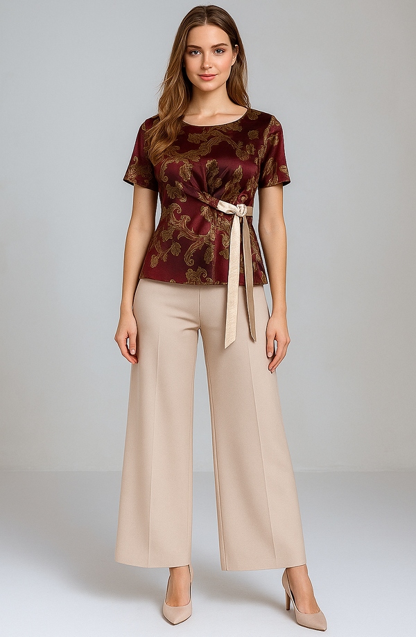 Jemný kulatý výstřih a vázačka působí žensky a nadčasově. Lehký a vzdušný materiál se příjemně nosí po celý den. Moderní paisley vzor ve vínovo zlatých tónech dodává halence elegantní a luxusní vzhled.