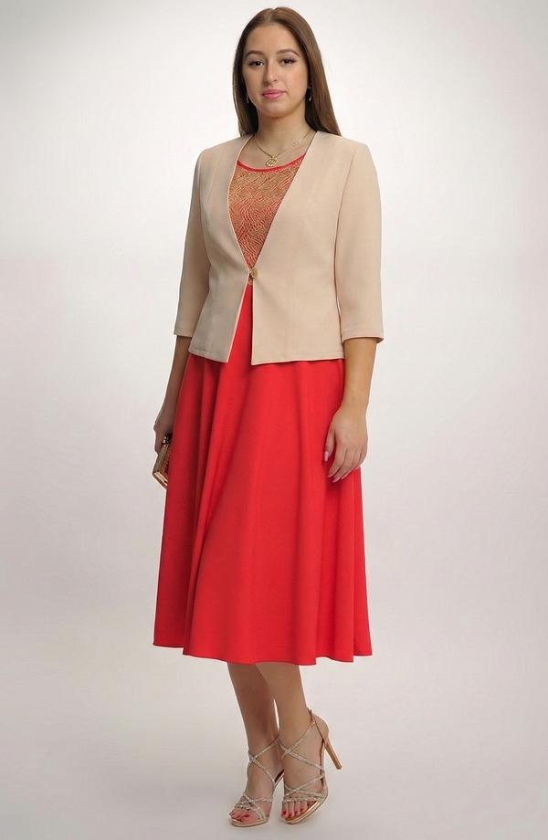 Elegantní plesové šaty v červené barvě jsou vhodné jako plesové šaty, šaty na svatbu, ale i na promoce a do divadla. Jsou ušité z jemné tkaniny s elastanem. Na sedýlku je použita jemná pavoučková zlatavá krajka. Živůtek má otevřená záda, ale jen tak, aby šlo použít pod šaty podprsenku. Živůtek doplňuje bohatá kolová sukně.