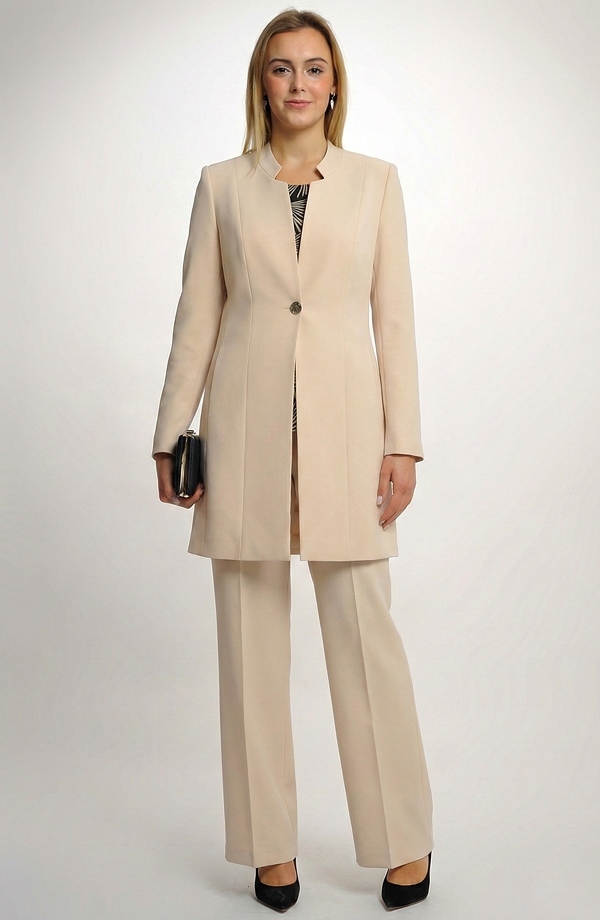 Společenský kalhotový komplet vhodný do společnosti, na svatbu. Tento sofistikovaný dámský kalhotový kostým v jemném béžovém odstínu je perfektní volbou pro formální i slavnostní příležitosti.
