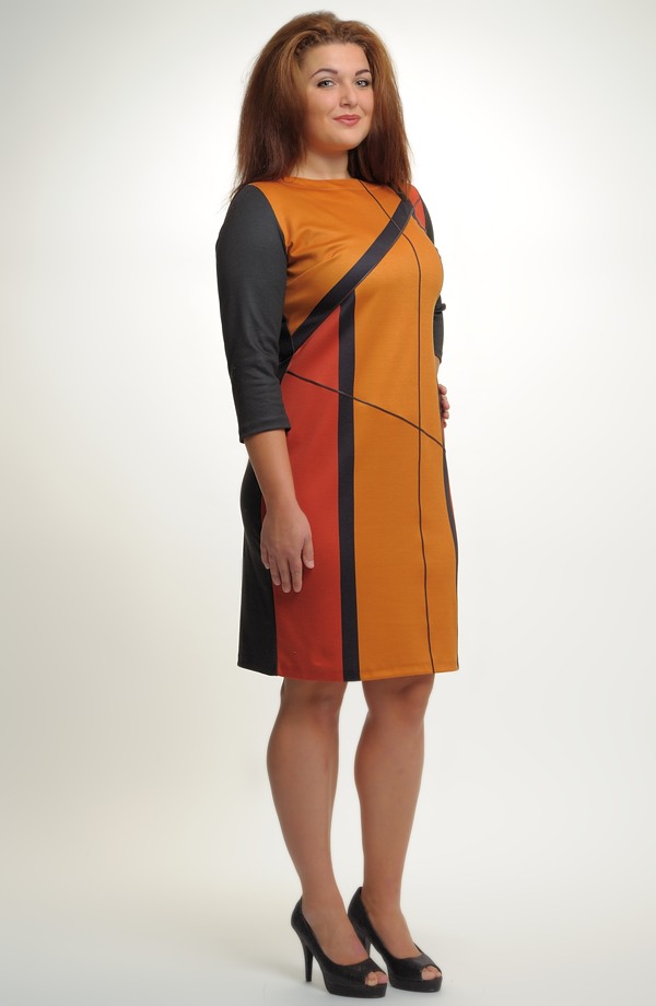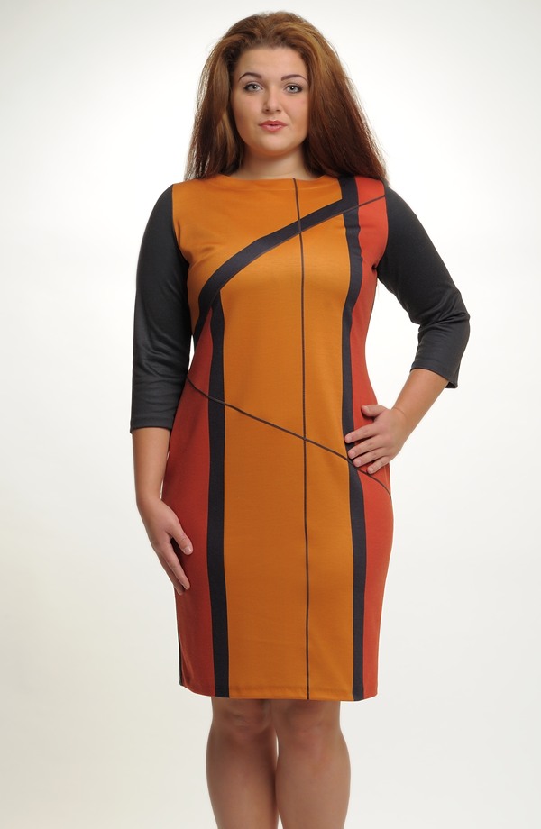 Dámské elegantní šaty pro plnoštíhlé mají jednoduchý střih, ale zaujmou výrazným grafickým vzorem.