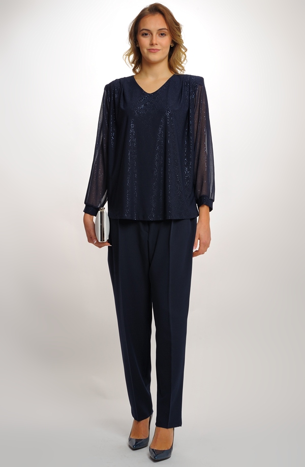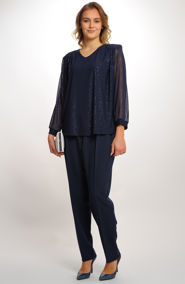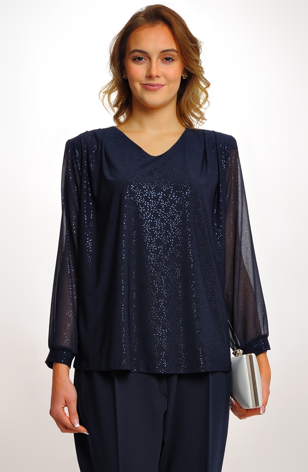 Elegantní dámská tunika v tmavě modré barvě je ideální volbou pro ženy, které hledají stylový a pohodlný outfit pro společenské i slavnostní příležitosti. Tunika je ušita z lehkého, splývavého materiálu s jemným leskem, který působí luxusně a zároveň decentně. Průsvitné rukávy ze šifónu dodávají modelu ženskost a půvab, zatímco volnější střih elegantně zakrývá drobné nedostatky postavy.