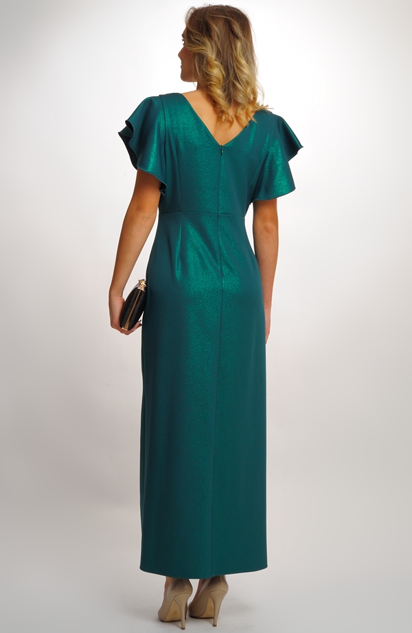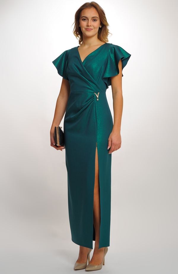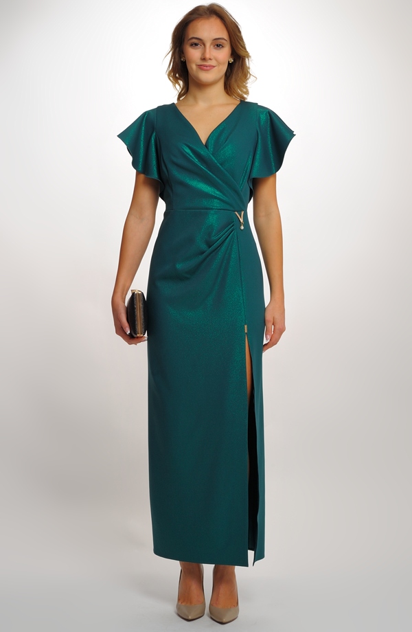 Šaty mají zavinovací živůtek s výstřihem do "V", který krásně zvýrazní dekolt, a elegantní motýlí rukávy pro vzdušný a pohodlný efekt. Dlouhá sukně s vysokým rozparkem opticky prodlužuje postavu a působí velmi žensky. Zlatá dekorativní spona v pase dolaďuje celkový luxusní dojem a jemně zvýrazňuje siluetu.