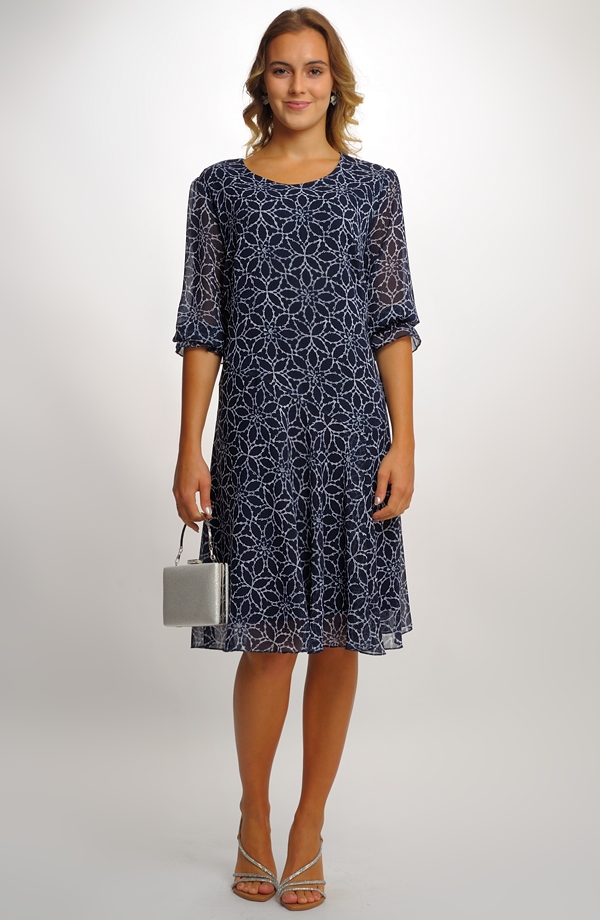 Model má tříčtvrteční rukávy z jemně průsvitné látky, kulatý výstřih a rozšiřující se sukni ke kolenům, která se při pohybu krásně vlní. Tento střih lichotí postavě a je ideální pro společenské akce, svatby, oslavy nebo slavnostní večeře.