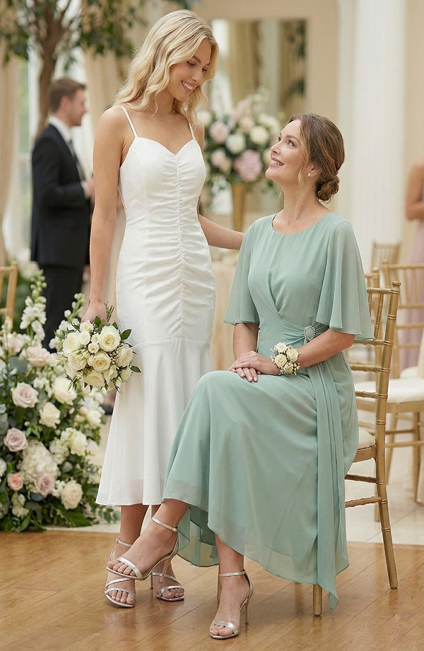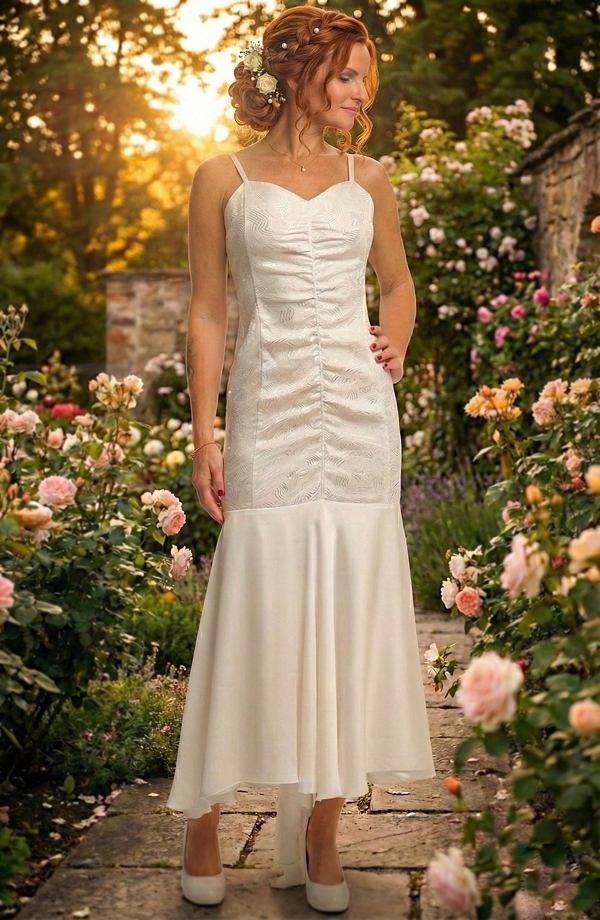 Bílé šaty na ples, na svatbu i na polonézu mají přiléhavý korzetový živůtek s tenkými ramínky a jemným vzorováním. Přední část je zdobená jemným řasením, které krásně schová bříško. Spodní část šatů se rozšiřuje do splývavé bohaté šifónové sukně ve střihu mořské panny, která je vzadu mírně prodloužená, což vytváří elegantní efekt vlečky.