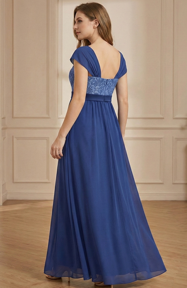 Šaty mají čtvercový výstřih a jemně průhledné krátké spadené rukávky ze šifonu, které dodávají romantický a vzdušný vzhled.