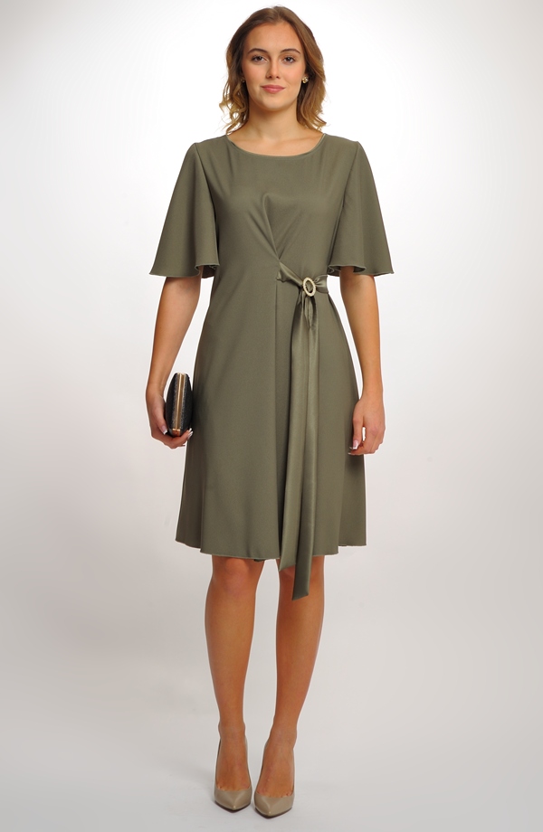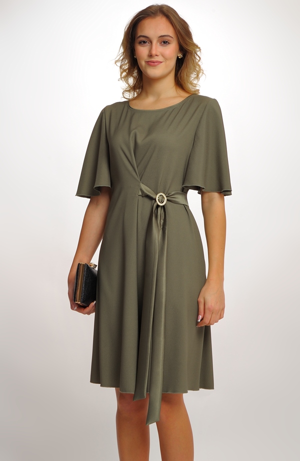 Společenské zavinovací šaty i pro plnější dívky jsou ušité z módního saténu v barvě zelené olivy.