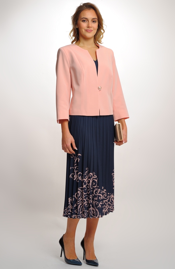 Kostýmek na svatbu v jemné barevnosti tvoří sako a společenské šaty v délce těsně pod kolena.