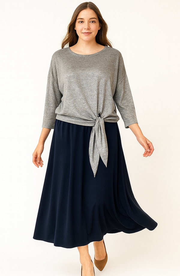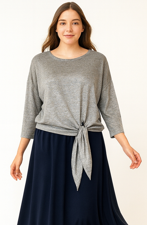Stylová šedá halenka s vázáním vpředu spojuje pohodlí a moderní vzhled.