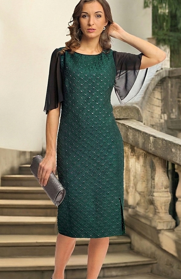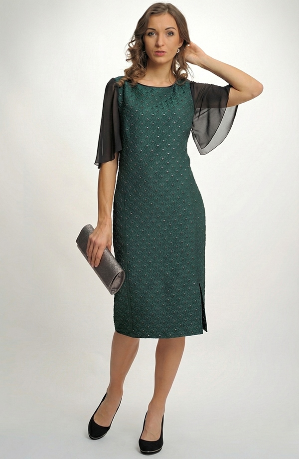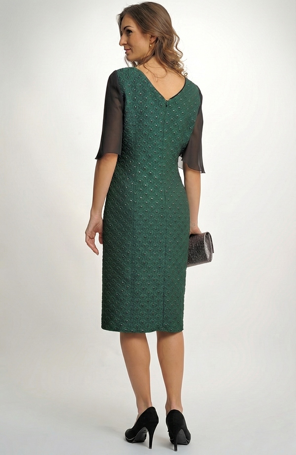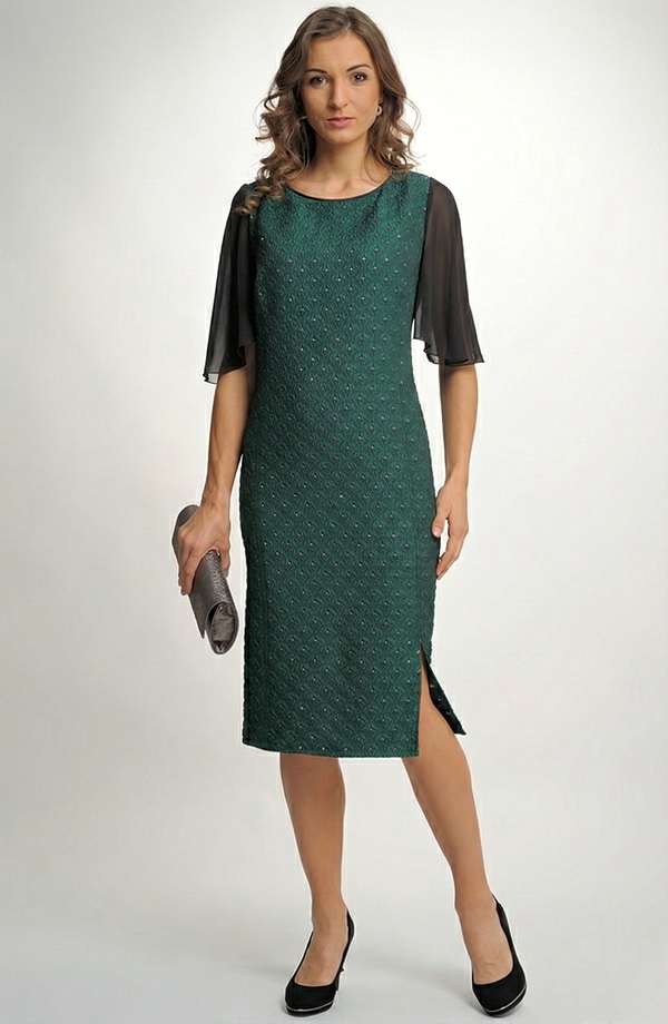 Dámské společenské koktejlové šaty jsou vyrobeny ze zajímavé látky. Šaty mají jednoduchý střih zeštíhlující postavu, na kterém vynikne tento zajímavý materiál. Módní rukávky a elegantní širší V výstřih na zádech dodávají šatům mladistvý ráz a člení postavu. Šaty, které jsou nyní velmi žádané, se hodí na každou společenskou příležitost. Můžete si je vzít do divadla, na svatbu, na promoce.... Šaty lze doplnit krátkým kabátkem 2790Kč. Každá žena je v těchto šatech elegantní a zároveň nepřehlédnutelná. Šaty jsou vhodné na svatbu, na promoci....