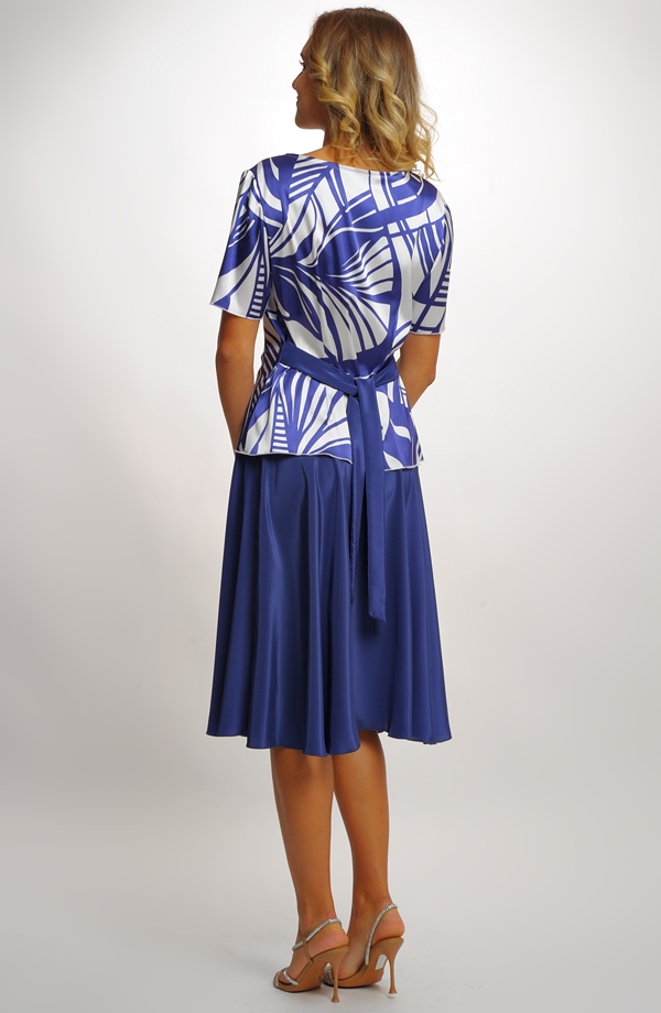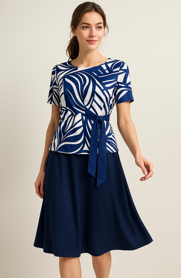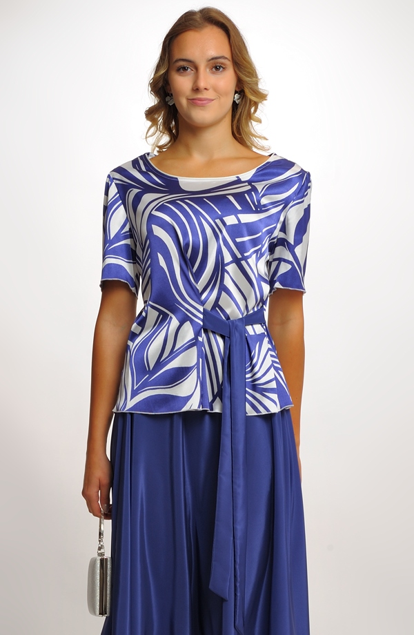 Horní díl s moderním geometrickým vzorem v kombinaci bílé a modré barvy krásně zvýrazňuje postavu a díky zavazování v pase opticky zeštíhluje.