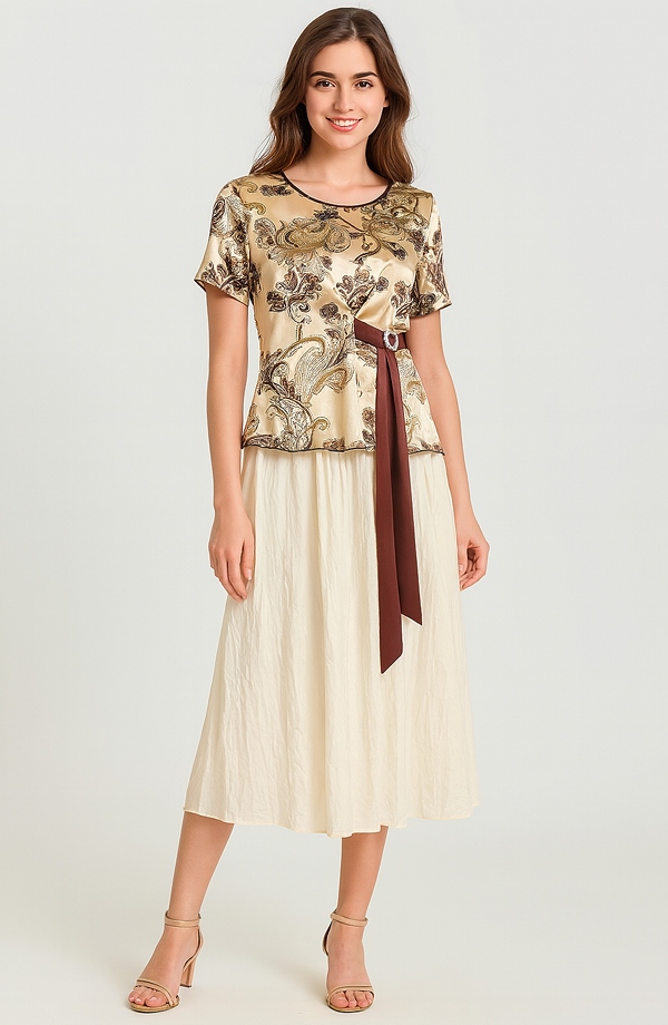 Splývavá krešovaná sukně je vyrobená z lehké béžové hedvábné látky. Krešovaná struktura dodává sukni ležérní boho styl. Je do ozdobné gumy, nadčasová a unosíte ji celý rok.