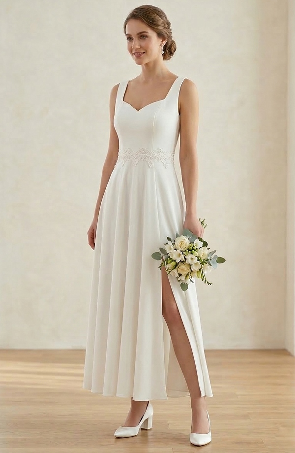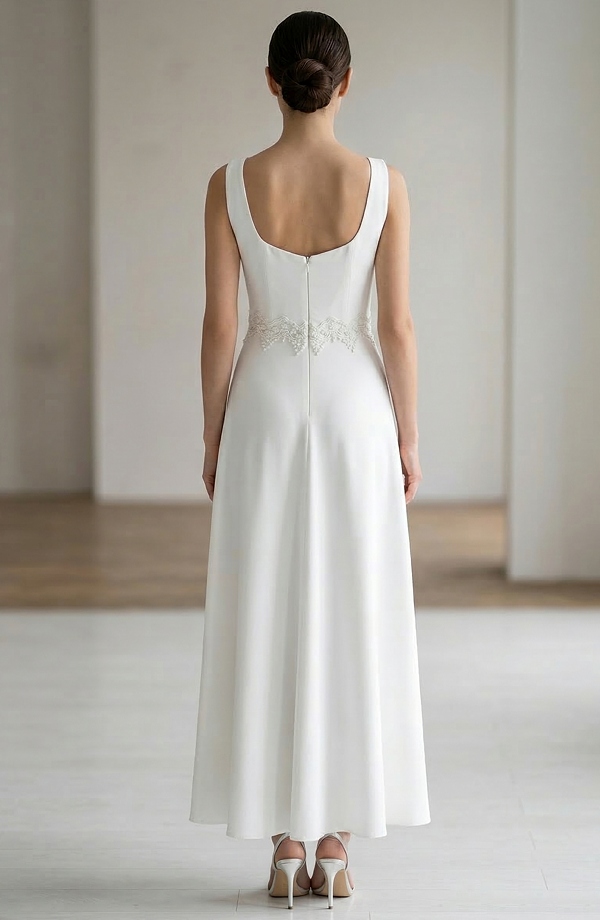 Dlouhé svatební a společenské šaty mají bohatou krajku v pase a ve výstřihu. Záda jsou dost otevřená, pas krásně vyštíhlený a bohatá sukně má vysoký rozparek. Bohatá sukně se při pohybu jemně vlní. Krajka a zajímavý střih šatů dává modelu luxusní vzhled. Šaty jsou jednoduché, ale velmi elegantní.