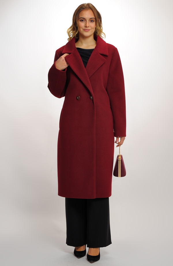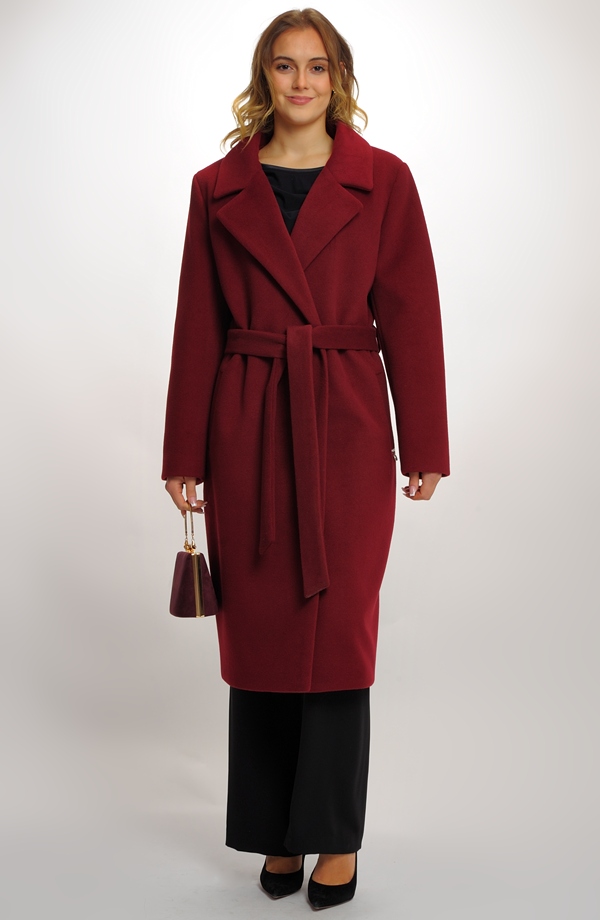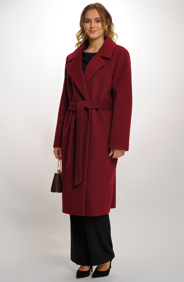Elegantní dámský kabát s páskem je vyroben z kvalitního vlněného flauše ve velmi módní vínové barvě. Stylový dámský vlněný kabát v luxusním bordó odstínu je ideální volbou pro ženy, které chtějí být elegantní i v chladném počasí. Tento dlouhý kabát s páskem zvýrazní ženskou siluetu a působí nadčasově. Kvalitní vlněný materiál poskytuje příjemné teplo, zatímco precizní střih a decentní detaily dodávají kabátu sofistikovaný vzhled.
