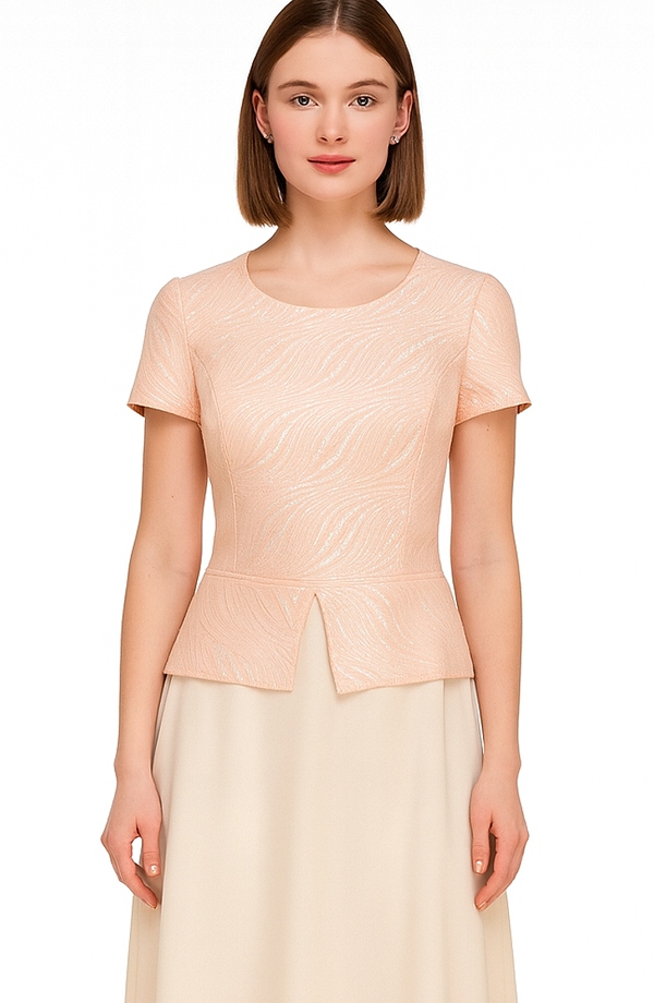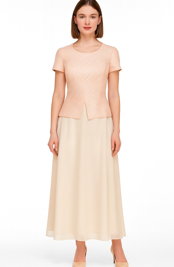 Šaty se skládají ze dvou částí – z propracovaného topu a elegantní sukně. Horní díl je vyroben z jemné látky s geometrickým vzorem se zlatou nití. Krátké rukávy a decentní výstřih do "V" opticky prodlužují postavu a dodávají šatům šarm. Top je mírně vypasovaný, což krásně tvaruje siluetu a dodává ženskou eleganci.
