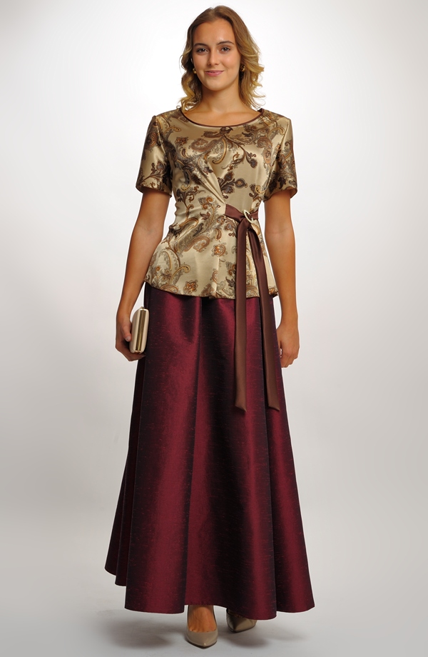 Dámské dlouhé společenské šaty se skládají ze zlatého elegantního topu s jemným leskem a paisley vzorem, který krásně doplňuje dlouhá dílová vínová sukně.