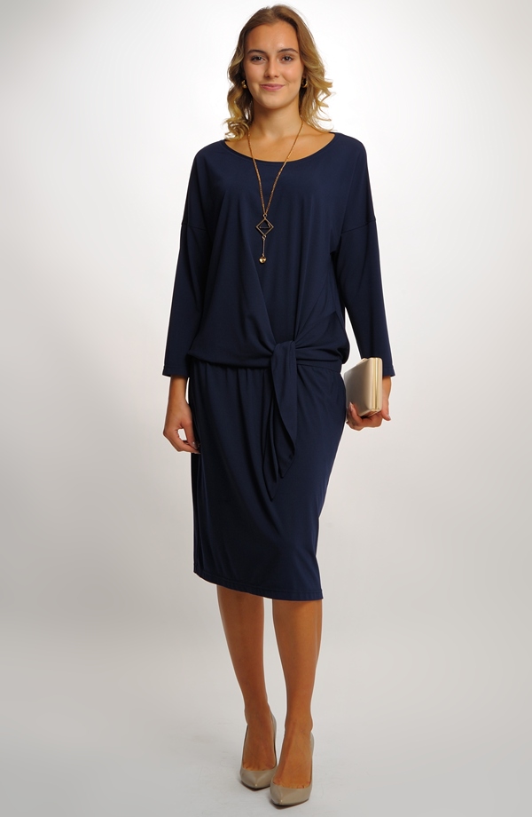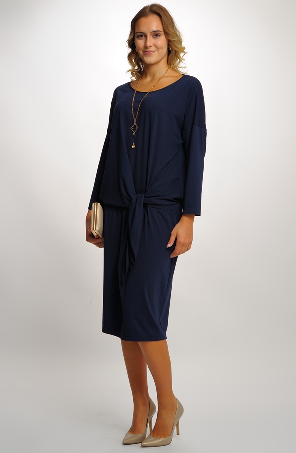 Šaty mají volnější střih s delším rukávem, kruhový výstřih a efektní uzel v pase, který opticky tvaruje siluetu a schová partie kolem pasu. Délka sahá lehce pod kolena, což působí decentně a elegantně.