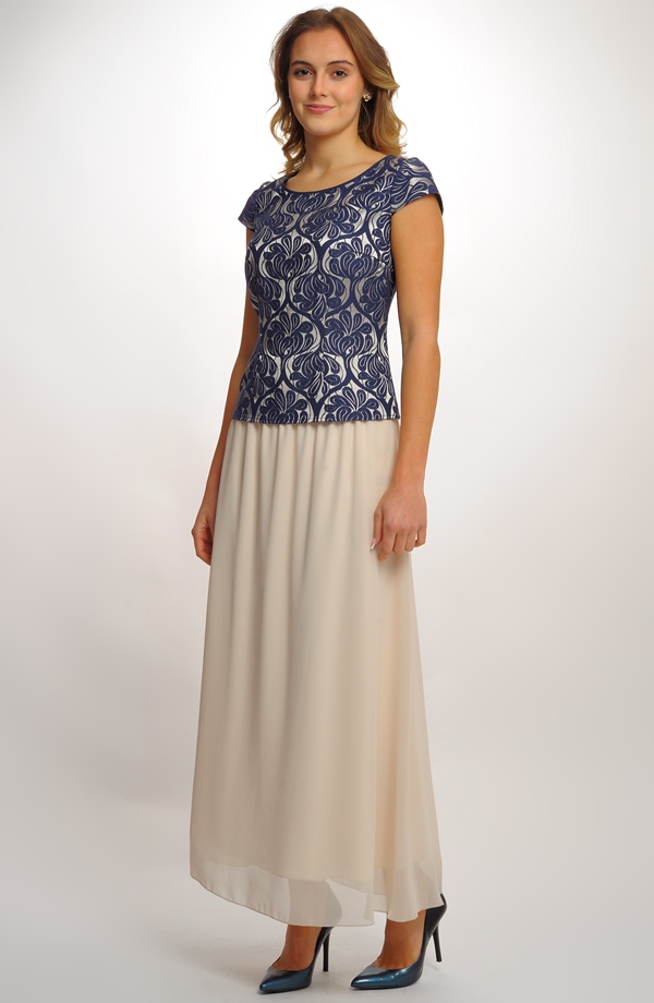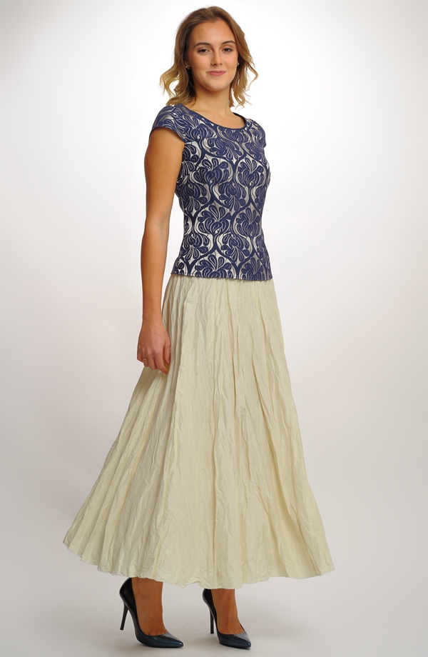 Tato elegantní dámská halenka v kombinaci modré a zlaté barvy vyniká svým nadčasovým designem a precizním zpracováním. Je vyrobena z brokátové tkaniny s ornamentálním vzorem, která působí slavnostně a sofistikovaně. Krátké rukávy, kulatý výstřih a jemně projmutý střih krásně zvýrazňují ženskou siluetu a dodávají modelu elegantní vzhled.