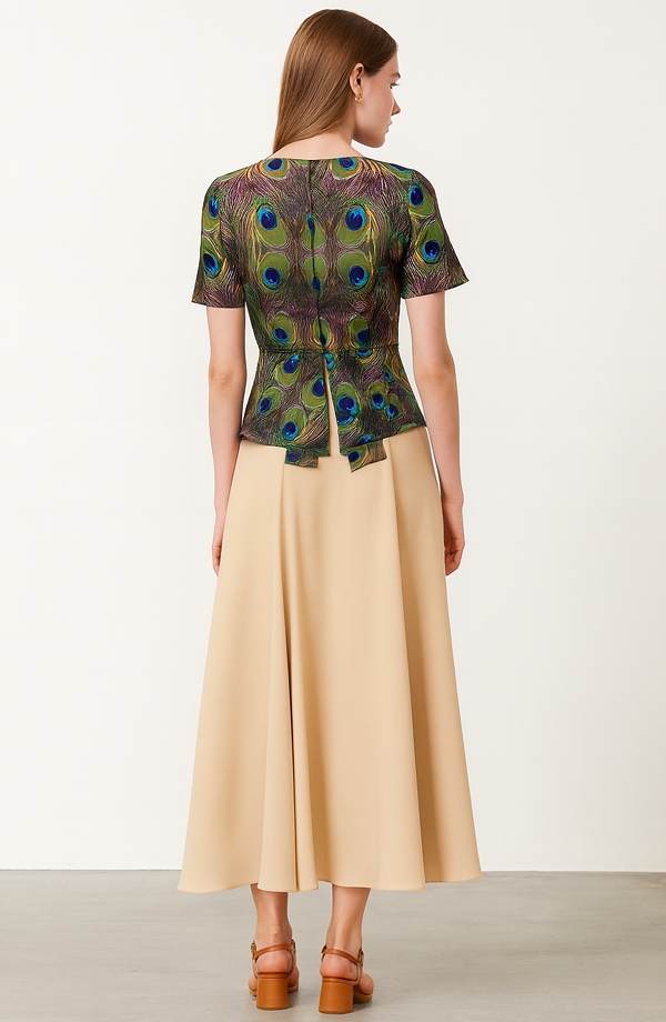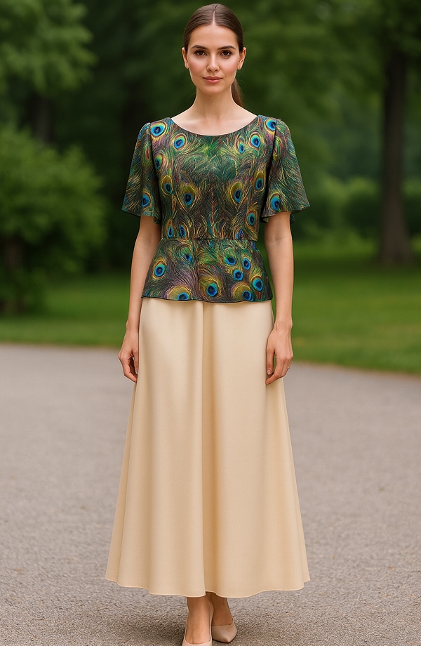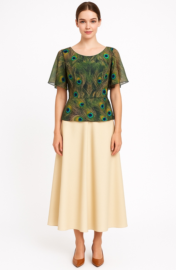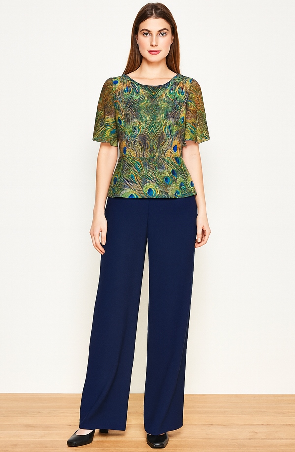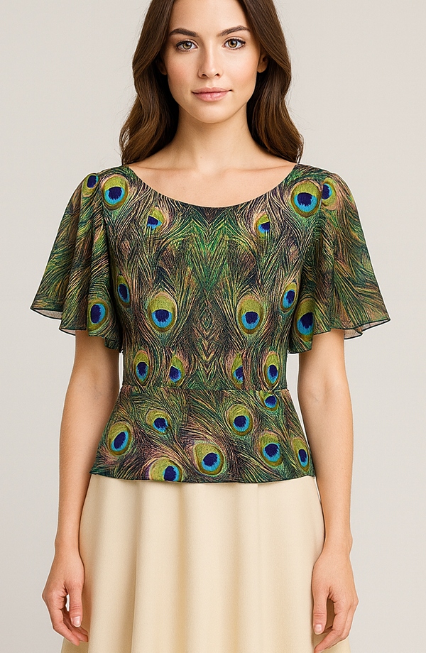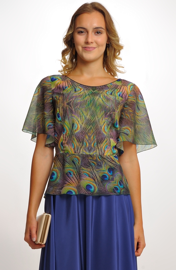 Tato elegantní halenka s potiskem pavích per z lehkého šifonu