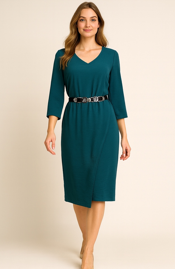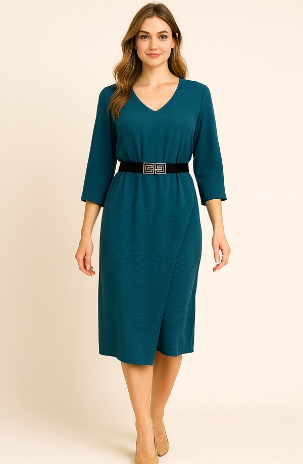 Dámské šaty v zeleno modré barvě jsou vhodné na svatbu jako host. Mají mírně krešovaný elastický materiál, který se hodí na zajímavý střih šatů. Jsou zajímavé materiálem, střihem a stříbrným páskem, který je součástí modelu. Jsou velmi decentní. Vzniká tak zajímavý netradiční vzhled šatů, který skrývá nerovnosti postavy a šaty dělají štíhlou postavu.