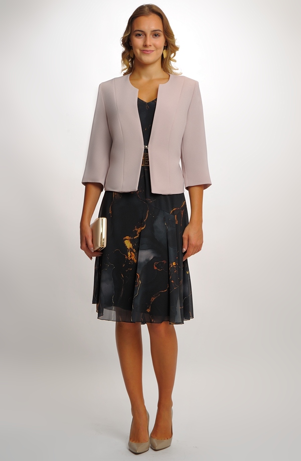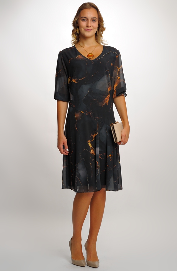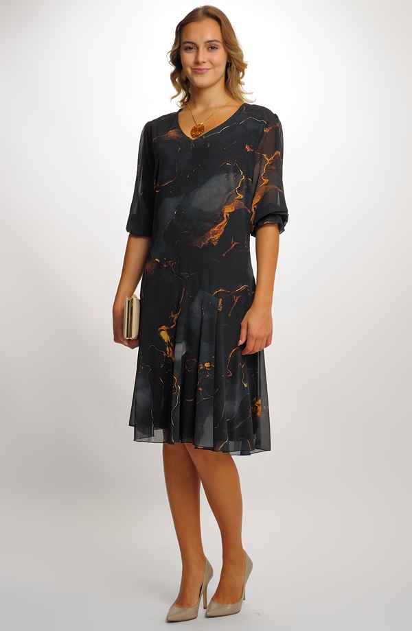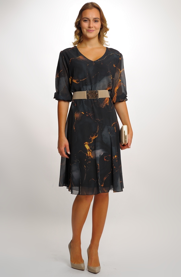 Společenské šaty pro plnoštíhlé ze šifonu mají jednoduchý střih zeštíhlující postavu, snížený živůtek a asymetrickou kolovou sukni Jemně odstíněná zajímavá barevná kombince podtrhuje eleganci modelu. Rukávy jsou nabrané do gumy. Šaty, které jsou nyní velmi žádané, se hodí na každou společenskou příležitost. Můžete si je vzít do divadla, na svatbu, na promoce... Tento typ šatů by neměl chybět v šatníku žádné plnoštíhlé ženy, protože je nadčasový, mladistvý a velmi praktický, jak na nošení, tak i na údržbu.