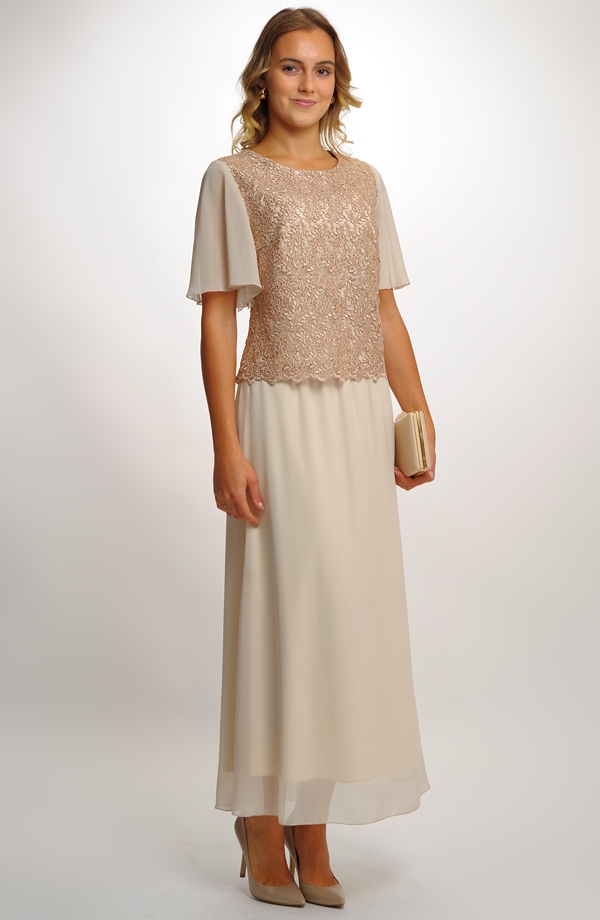 Kombinuje jemný šifon s krátkými rukávy a zdobený přední díl z krajkované látky se zlatavým leskem.