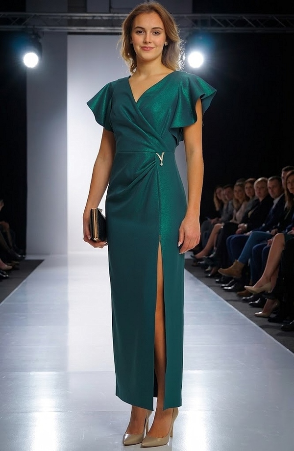 Šaty mají zavinovací živůtek s výstřihem do "V", který krásně zvýrazní dekolt, a elegantní motýlí rukávy pro vzdušný a pohodlný efekt. Dlouhá sukně s vysokým rozparkem opticky prodlužuje postavu a působí velmi žensky. Zlatá dekorativní spona v pase dolaďuje celkový luxusní dojem a jemně zvýrazňuje siluetu.