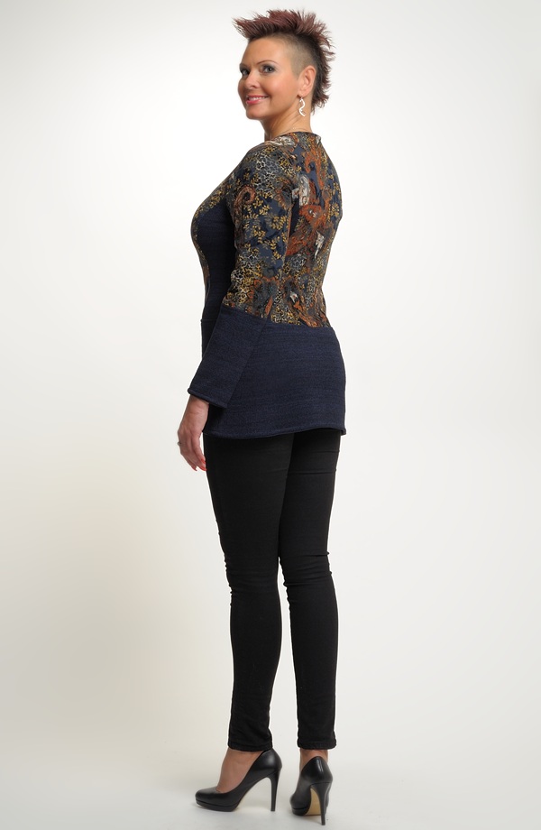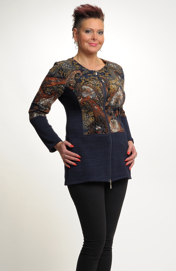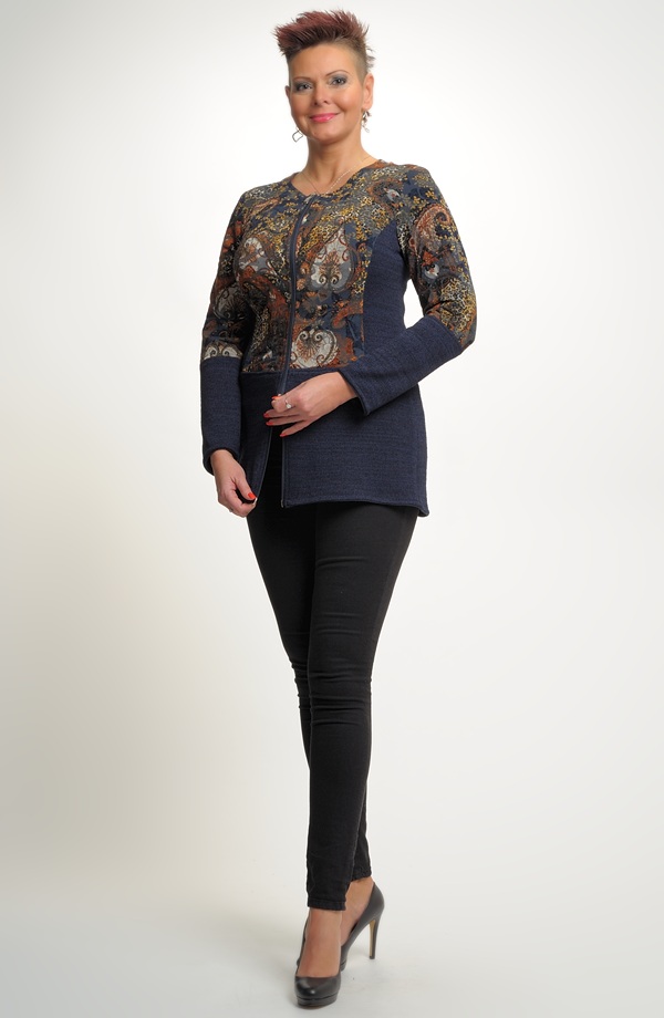 Sportovně elegantní pletený svetr na zip kombinovaný ze dvou druhů materiálů, pleteniny a poflokované pleteniny se vzorem, má střih, který zeštíhluje postavu.