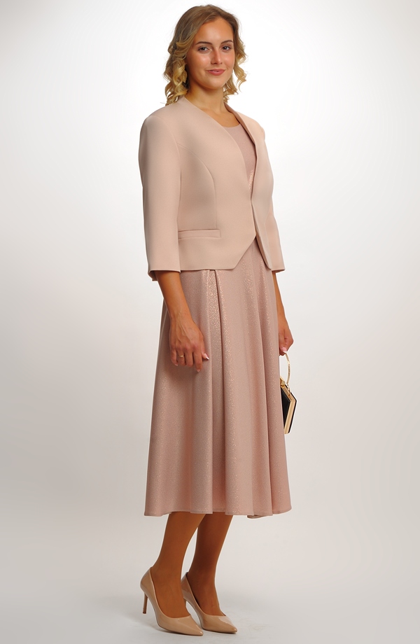 Elegantní dámský komplet v jemné tělové barvě je ideální volbou pro svatby, plesy i jiné slavnostní příležitosti. Tento luxusní dvoudílný outfit se skládá z jemně třpytivých midi šatů s krátkým rukávem a lehkého kabátku se 3/4 rukávy, který dodává celkovému vzhledu noblesu a nadčasovou eleganci.