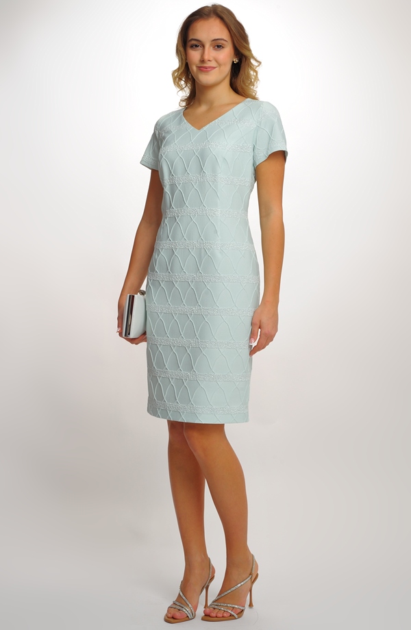 Šaty na svatbu pro matku nevěsty v módní barvě mají zajímavý materiál, který se hodí na jednoduchý střih pouzdrovek. Jsou nápadité, materiálem a barvou a jsou velmi decentní a jednoduché. Vzniká tak zajímavý netradiční vzhled šatů a šaty dělají štíhlou postavu. Je pěkné doplnit šaty jemným šátkem a kabelkou. Jaké zvolíte sako, je jen na vás. Béžové nebo smetanové sako s otevřenou fazónou šaty krásně podtrhne.