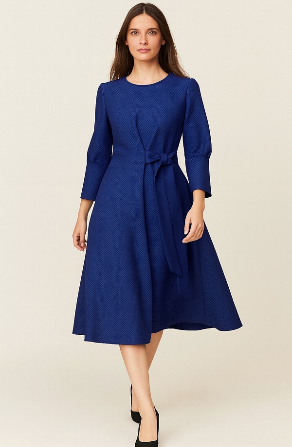Model má kulatý výstřih, 3/4 rukávy s jemným nabíráním v oblasti loktů a midi délku sukně do půli lýtek. Pružná látka s decentní strukturou dodává šatům exkluzivní vzhled. V pase jsou zvýrazněny elegantní vázačkou na mašli, která podtrhuje ženskou siluetu.