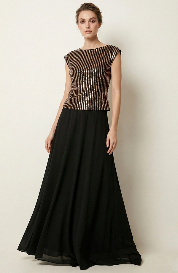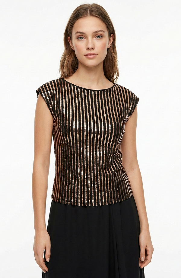 Elegantní černo-zlatá halenka je výrazným a přitom nadčasovým kouskem, který nesmí chybět v šatníku žádné ženy milující společenskou módu. Halenka je zdobena vertikálními zlatými pruhy, které opticky prodlužují postavu a dodávají modelu luxusní večerní vzhled. Černý podklad zjemňuje lesk a zajišťuje snadnou kombinovatelnost.