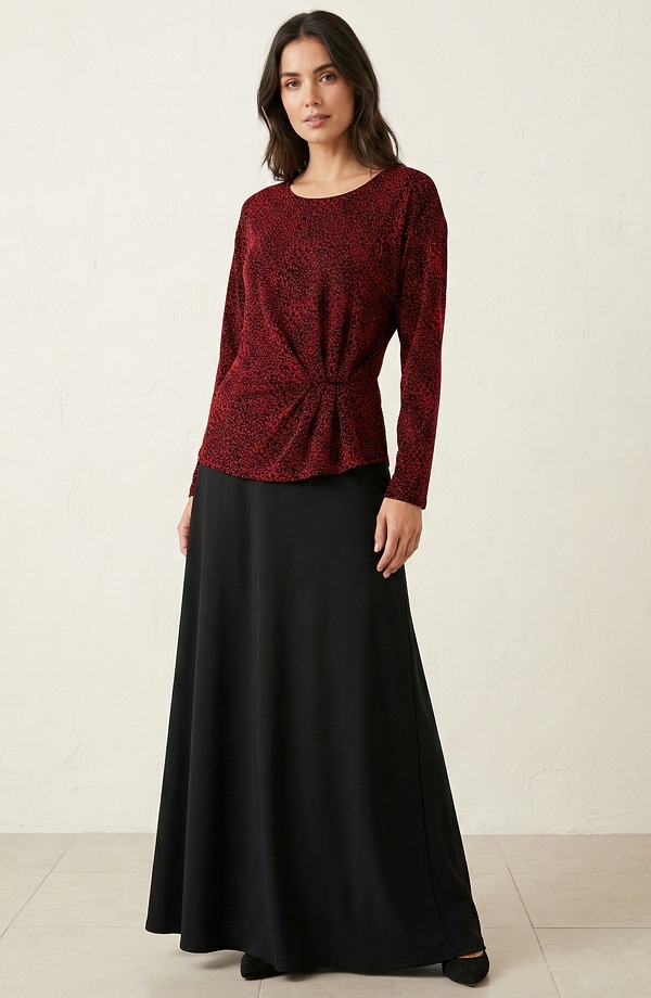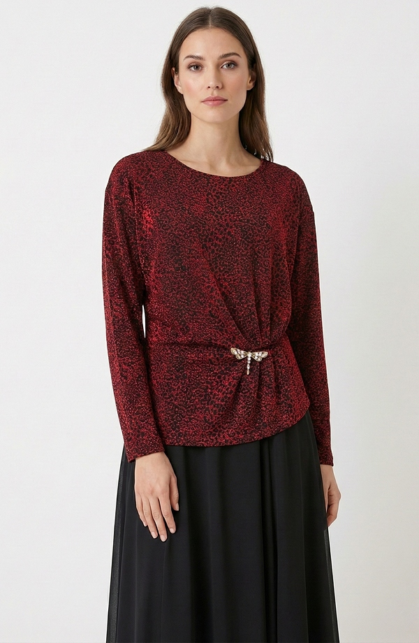 Elegantní lurexová halenka v červeno-černém jemném vzoru je ideální volbou pro ženy, které hledají