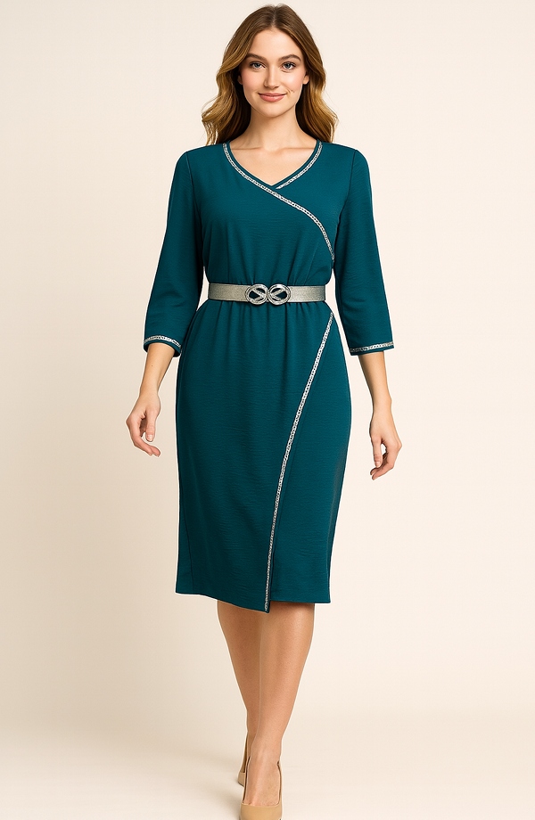 Dámské šaty v zeleno modré barvě jsou vhodné na svatbu jako host. Mají mírně krešovaný elastický materiál, který se hodí na zajímavý střih šatů. Jsou zajímavé materiálem, střihem a stříbrným jemným zdobením a páskem, který je součástí modelu. Jsou velmi decentní. Vzniká tak zajímavý netradiční vzhled šatů, který skrývá nerovnosti postavy a šaty dělají štíhlou postavu.