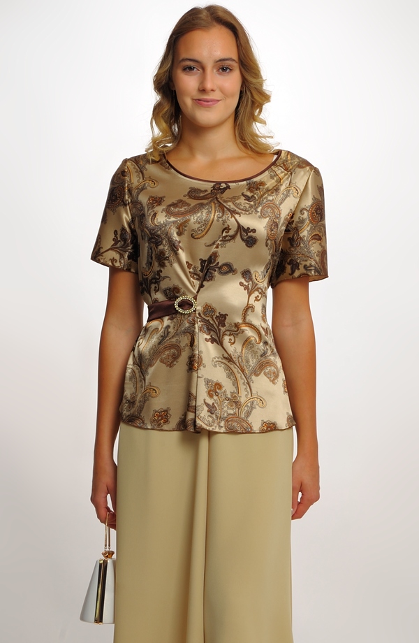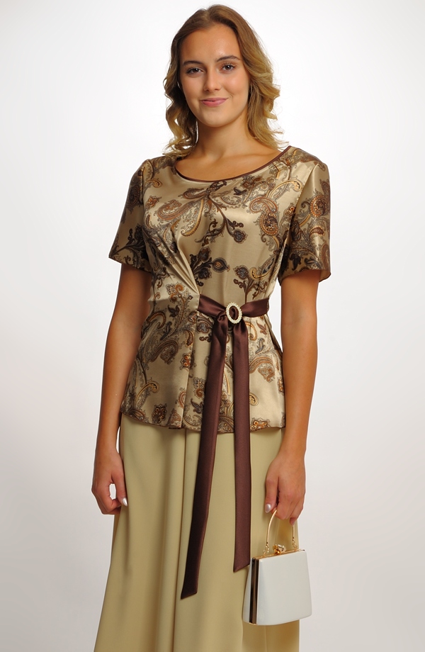 Hedvábný top s krátkým rukávem v béžovo-zlatém odstínu je zdobený jemným paisley vzorem a doplněn kontrastním hnědým páskem s ozdobnou sponou, který zvýrazní pas a dodává modelu rafinovanost.