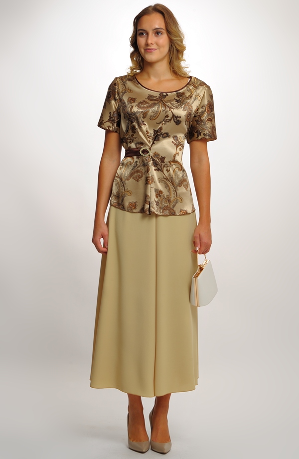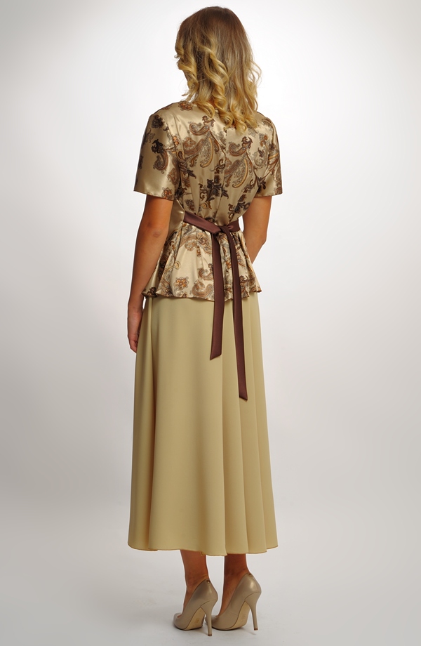 Elegantní dámský společenský komplet tvoří stylový top a dlouhá sukně, které dohromady vytvářejí nadčasový outfit vhodný pro slavnostní příležitosti.