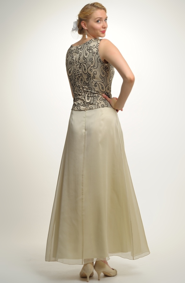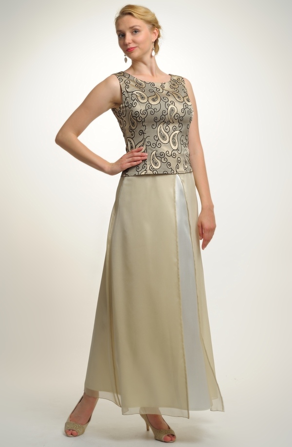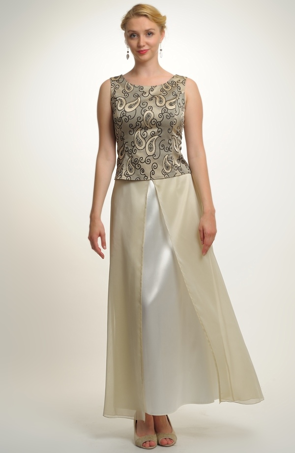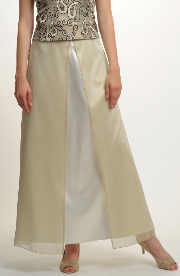 Letos velmi moderní svatební a společenský top na široká ramínka je vyroben z elastické žakárové tkaniny ve zlatavé barvě. K topu se hodí dlouhá šifónová sukně. Top zeštíhluje postavu a sluší i plnoštíhlým nevěstám. Komplet se hodí na svatbu i do společnosti. Je velmi variabilní.