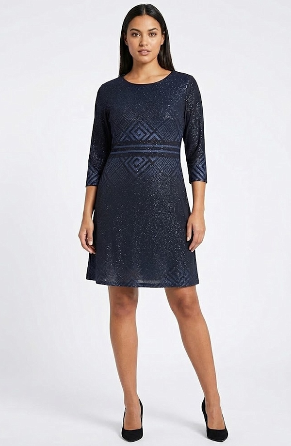 Velmi slušivé jednoduché elegantní šaty do společnosti z módní pleteniny s jemným lurexem jsou vhodné na svatbu nebo na jakoukoliv společenskou akci. Jednoduché řešení střihu, módní barva s decentním vzorem a jemný lesk dělají z těchto šatů velmi zajímavý a elegantní model.