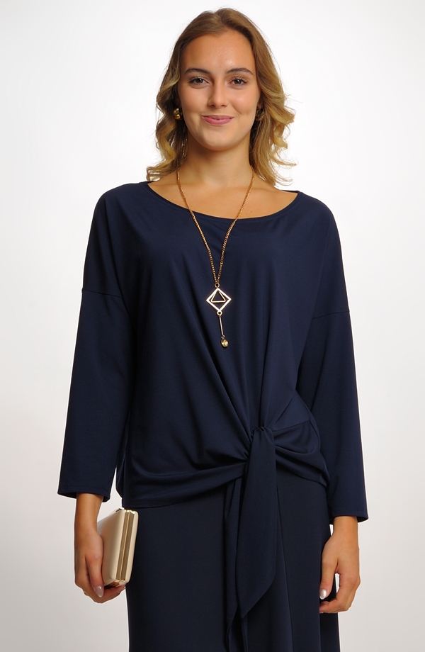 Dámská halenka volnějšího střihu se hodí ke kalhotám, sukni, ale i do kostýmku. Je ušita z velmi příjemné pleteniny a je zdobena lemováním u výstřihu a střihovým podkasáním na uzel.