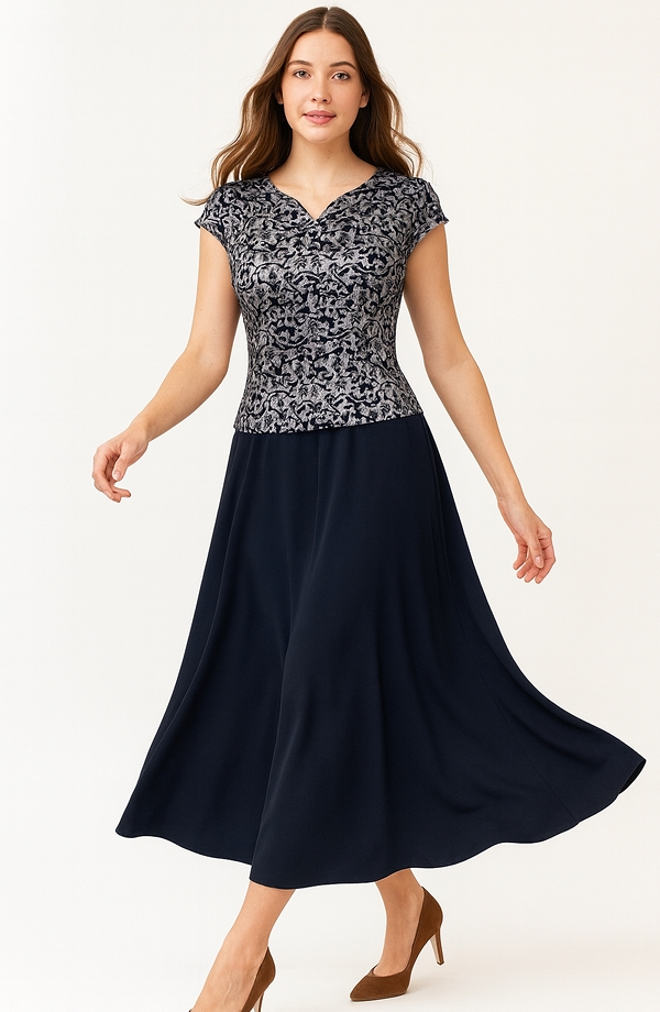 Společenská halenka z elastické tkaniny se stříbrným vzorem má zajímavě řešený výstřih, módní malé rukávy.