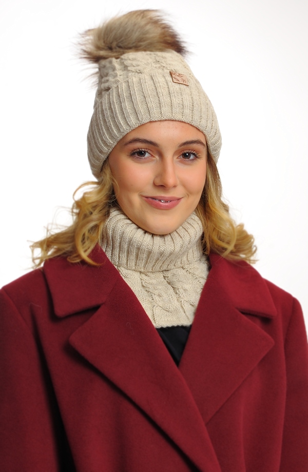 Zimní čepice s bambulí je pletená do pruhů z angorové bouclé příze. Lem je zpevněný gumou, aby dobře přiléhal na hlavě. Bambulka je z kožešiny.